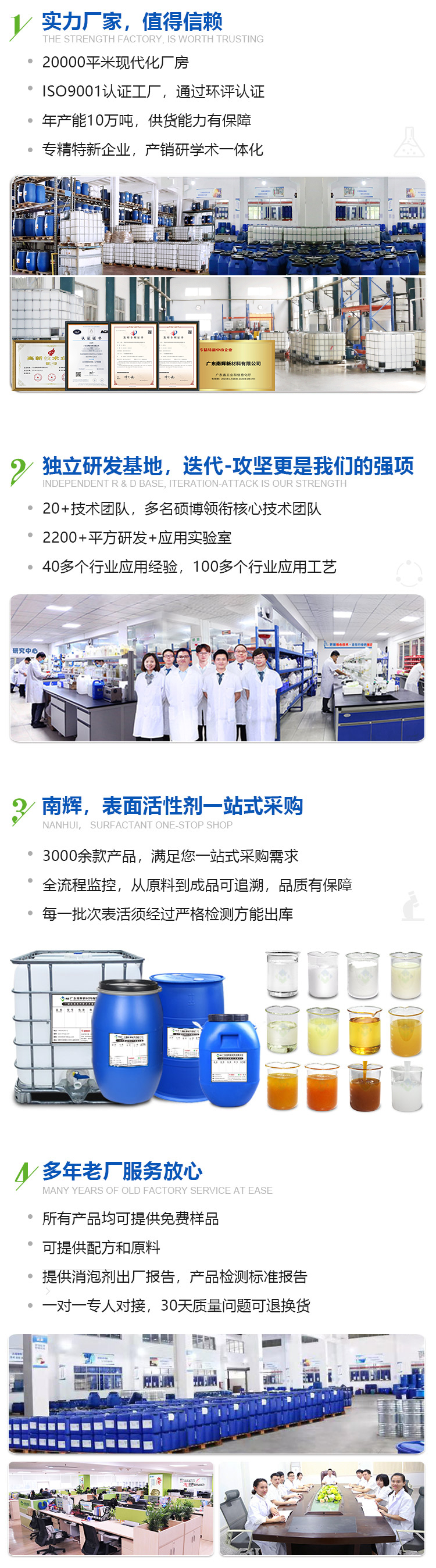 廣東南輝新材料有限公司,是一家致力于表面活性劑研發(fā)、生產(chǎn)、銷售為一體的國(guó)家高新技術(shù)企業(yè),擁有獨(dú)立的研發(fā)基地,主要研發(fā)產(chǎn)品有:乳化劑、滲透劑、勻染劑、司盤、吐溫、消泡劑等3000余款產(chǎn)品。南輝擁有20000平方米的現(xiàn)代化生產(chǎn)車間,年產(chǎn)能可達(dá)10萬噸。通過ISO9001:2015質(zhì)量管理體系認(rèn)證,已獲得十余項(xiàng)不同產(chǎn)品的發(fā)明專利授權(quán),被評(píng)為廣東省"專精特新"企業(yè)。從2018年開始批量出口至俄羅斯、日本、馬來西亞、印度、秘魯?shù)葒?guó)家,已成為國(guó)內(nèi)目前主要的表面活性劑生產(chǎn)廠家。